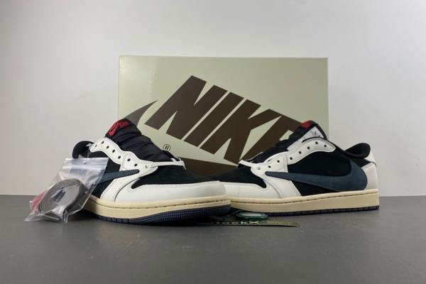 This pair of shoes covers the upper with a combination of black matte material, white leather and navy blue suede. The matte texture of the matte, the fine luster of the leather and the granular texture of the suede create a triple material contrast. It not only continues the classic low-top silhouette of the Air Jordan 1, but also adopts Travis Scott's signature "reversal" visual logic. Breaking the traditional color layout of shoes - the navy blue Swoosh extends to the inner side of the shoe, paired with a red logo label on the tongue, enhancing the recognition of the collaboration. The aged beige midsole, with its own retro "dressing filter", gives the shoe a relaxed street atmosphere even before wearing.