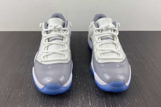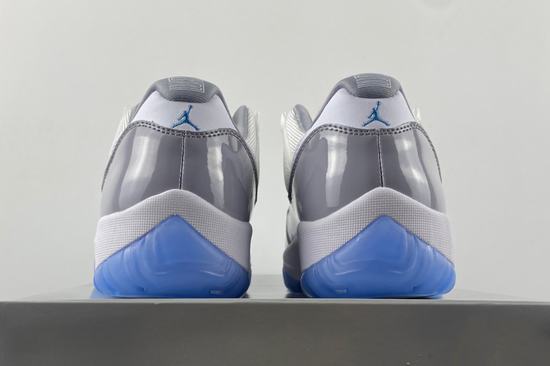 The shoes are displayed in white, college blue and cement grey. The Air Jordan 11 Low series is similar to the "Cool Grey" series, with a white mesh upper, a leather heel, and a cement gray patent leather fender. The cheap retro jordan 11 University Blue Jumpman logo on the white midsole and snow and ice outsole perfectly illustrates this design.