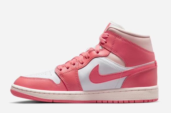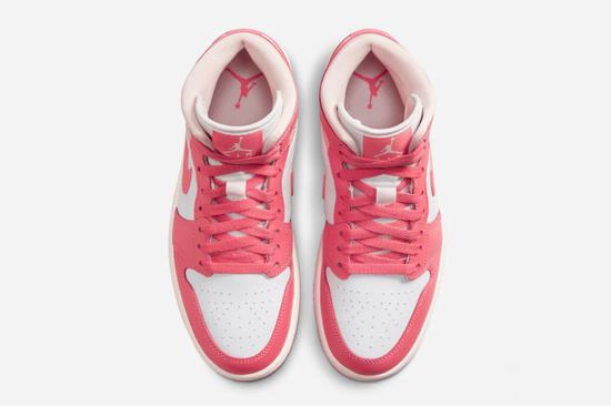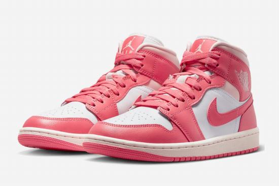 Air Jordan 1 Mid draws design inspiration from the first year, using simple and generous design with a touch of novelty, classic design is not fashionable, specially created for leisure daily activities. Jordan Brand once again creates a new color - WMNS Air Jordan 1 Mid "Strawberries and Cream", lively and sweet pink dress, for girls to bring more beautiful wearing experience. The upper is made of white leather, with bright pink tone stitching, presenting a simple and sweet shape. The tongue Jumpman Logo and the upper Wings Logo are presented in a light pink tone on top of a bright pink color. Finally, it is equipped with beige white to make old midsole and bright powder outsole to improve the whole shoe design.